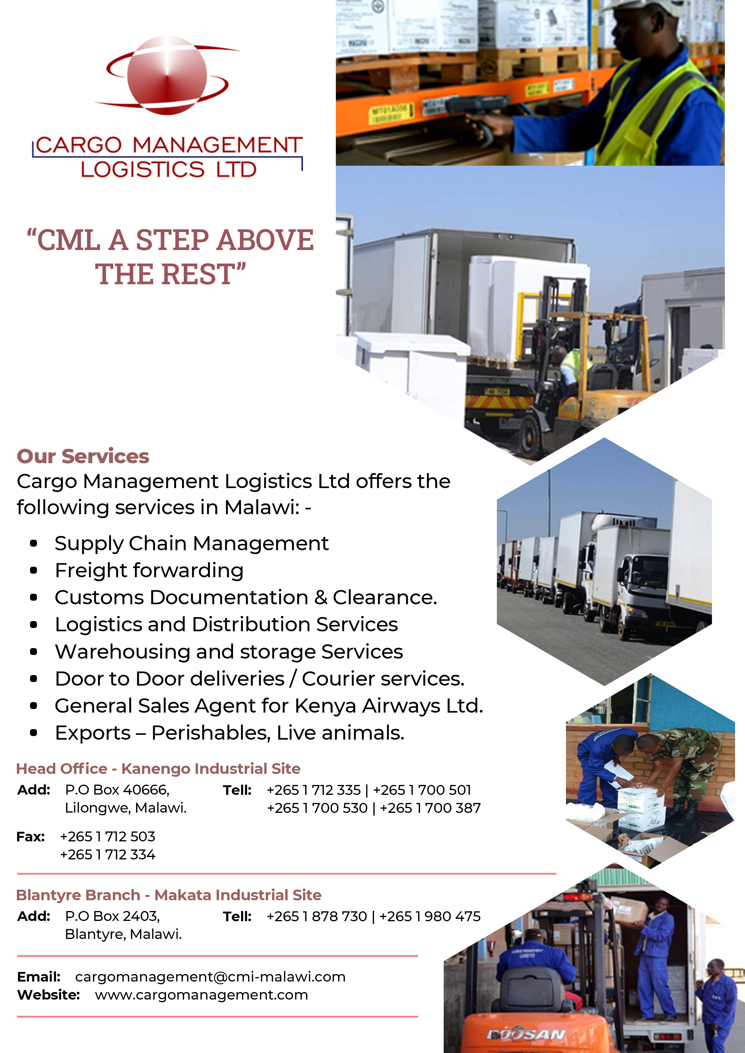 Cargo Management Logistics Ltd then called "Cargo Marketing International Ltd” was established in Malawi in 1989, and has its head office in Lilongwe. Over the years, we have grown to become an import and export freight handling, warehousing and local transport and distribution partner to many clients. We have branches across all major cities in Malawi including offices at all entry borders and airports. We have well trained and experienced members of staff who are directly involved in various supply management projects. Our track record, coupled by the vast experience and qualifications of our staff, confidently enables us to execute any logistics project professionally and efficiently.